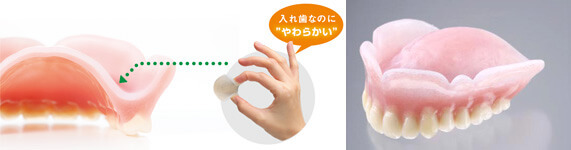 硬い入れ歯の裏面を生体用シリコーンというやわらかいクッションで覆う、全く新しい入れ歯の技術です。生体用シリコーンの弾性が、入れ歯でグッと噛んだときの歯ぐきにかかる負担をやわらげ、驚くほどの吸着力を発揮します。「痛い・噛めない・外れやすい」といった、従来の入れ歯の悩みを解消するとともに、歯ぐきをやさしく守ります。<総入れ歯・部分入れ歯に対応>