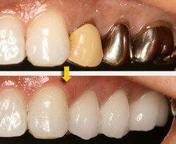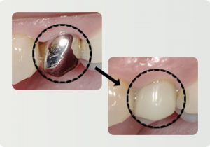 小臼歯に銀歯が入っていると、口を開いたときや笑ったときに目立つものです。ハイブリットセラミッククラウンという治療法で保険診療ができるのです